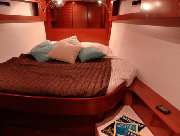 • Cabine com cama com roupas castanhas e brancas, almofadas coloridas e revistas numa mesa lateral