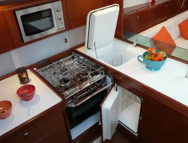 • Cozinha compacta com fogão inox, frigorífico e congelador embutidos, bancada com tigela azul e tomates, almofadas laranja num interior de barco