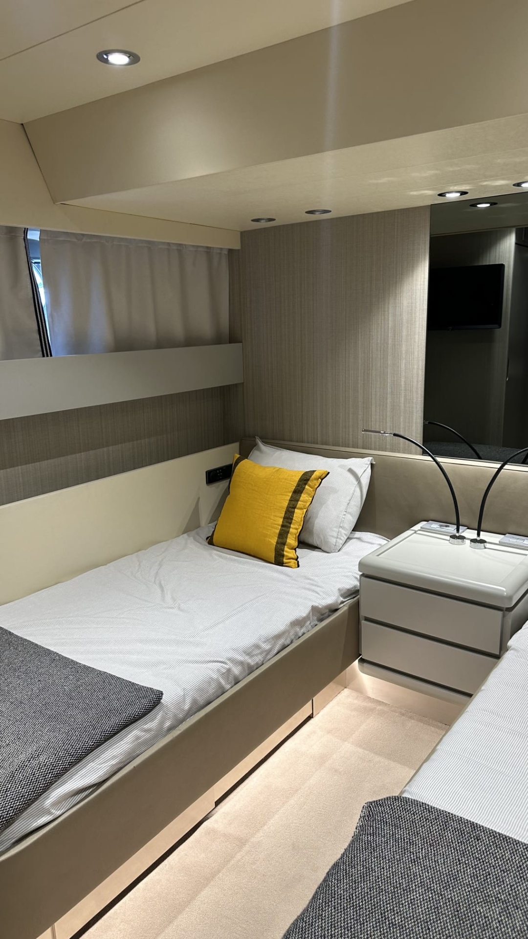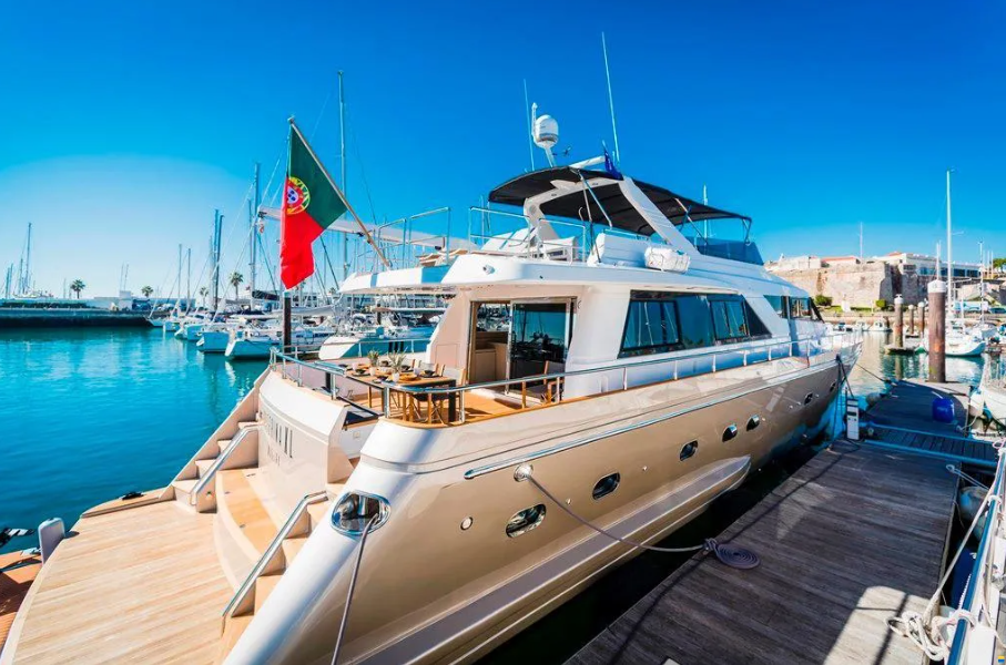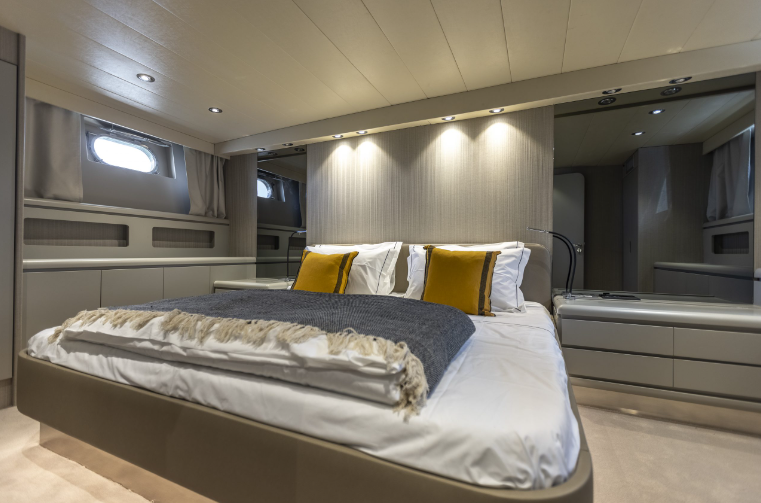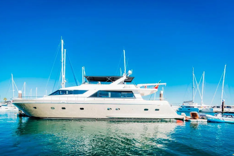 Luxuoso iate, comparável a um hotel de cinco estrelas, com capacidade para 17 pessoas, é composto por uma suite de luxo  e  duas cabines duplas, casas de banhos, cozinha equipada, area gourmet interior e exterior, bar, televisão, flybridge espaçoso com espreguiçadeiras dobraveis.