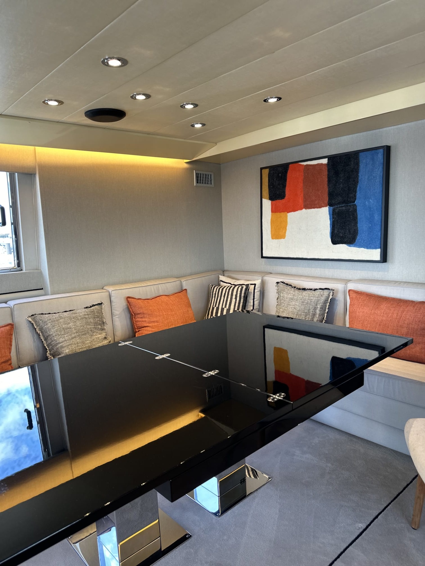 • Área de refeições de iate com mesa de vidro, sofás brancos e almofadas coloridas