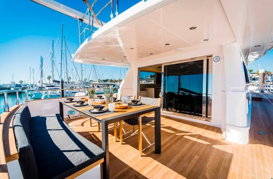 • Convés de iate com mesa de jantar montada e vista para porto com barcos