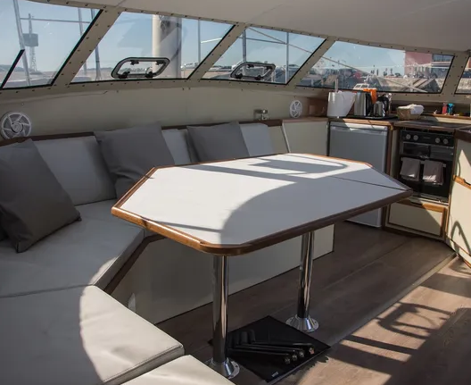 • Interior de barco com mesa, bancos estofados e cozinha compacta
