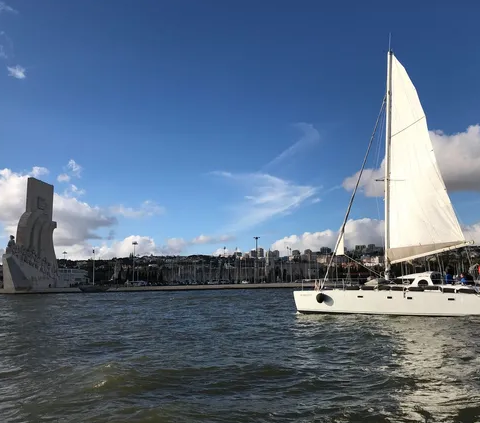 • Veleiro branco com vela grande branca na água com monumento e barcos ao fundo