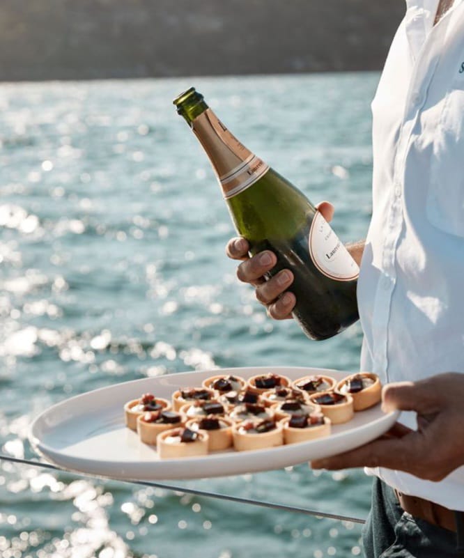 • Pessoa com camisa branca segura garrafa de champanhe e prato com mini tartes junto ao mar